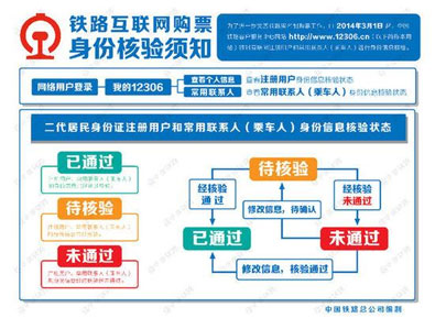 據(jù)介紹,實(shí)施身份信息核驗(yàn)后,在12306網(wǎng)站上使用二代居民身份證的注冊(cè)用戶和常用聯(lián)系人身份信息將有“已通過(guò)”、“待核驗(yàn)”、“未通過(guò)”三種核驗(yàn)狀態(tài),使用護(hù)照、港澳居民來(lái)往內(nèi)地通行證、臺(tái)灣居民來(lái)往大陸通行證的注冊(cè)用戶和常用聯(lián)系人身份信息將有“已通過(guò)”、“請(qǐng)報(bào)驗(yàn)”、“預(yù)通過(guò)”、“未通過(guò)”四種核驗(yàn)狀態(tài)。